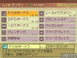 先にそれぞれのアイコンを説明しておくと、剣マークが剣スキル、斧マークが斧スキル、上下にON・OFFのあるスイッチのようなマークがスイッチスキル、力こぶがPOWボーナス、人がダッシュしているのがSPDボーナス、本のマークがINTボーナス、ドーナツみたいな輪っかのマークが補助スキル、地図のようなマークで茶色いアイコンがフィールドスキルです。